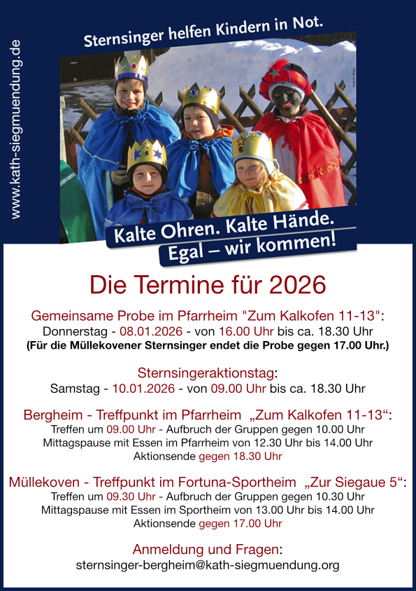 Am Samstag, den 10.01.2026, ziehen die Sternsinger sowohl durch Bergheim (St.Lambertus), als auch durch Müllekoven (St.Adelheid). Die genauen Termine zur Aktion gibt es auf dem Terminflyer weiter unten.
